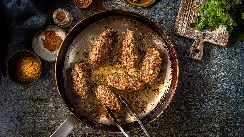 Sekoita kulhossa käsin jauheliha, sipuli, valkosipuli, chilijauhe, muskottipähkinä, Kikkoman soijakastike, persilja ja minttu. Muotoile seoksesta kuusi ovaalinmuotoista pötköä. Kuumenna oliiviöljy pannulla ja ruskista koftat joka sivulta.