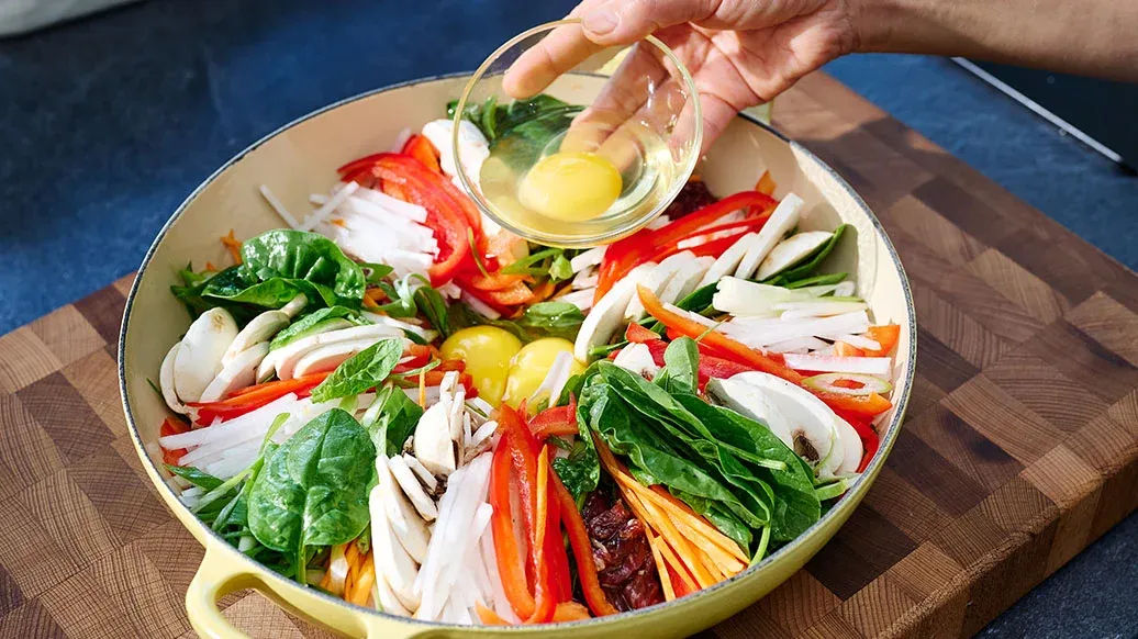 Riko kananmunat kattilan keskellä olevaan aukkoon. Laita kattila keskilämmölle ja kaada vesi ainesten sekaan. Kun kananmunat ja kasvikset ovat kypsiä, sekoita varovasti ja tarjoile paistetun riisin kanssa (vaihe 5).