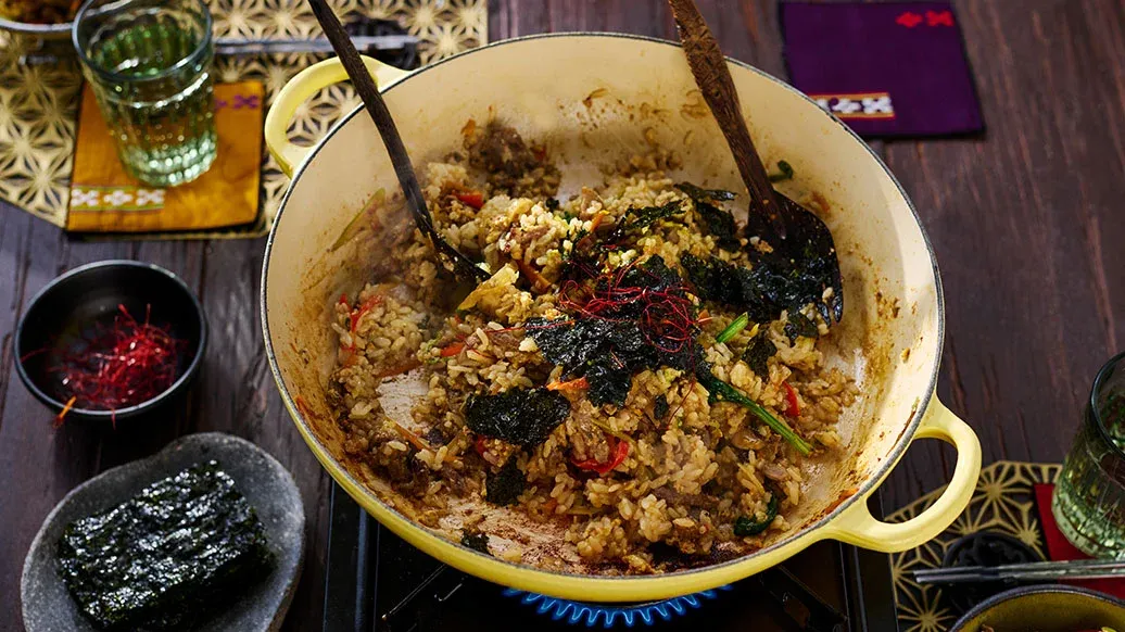 Kuumenna Kikkoman paahdettu seesamiöljy kattilassa. Lisää keitetty riisi sekä Kikkoman teriyakikastike ja paista kunnes riisi on lämmennyt. Tarjoile riisi hot potin kera.