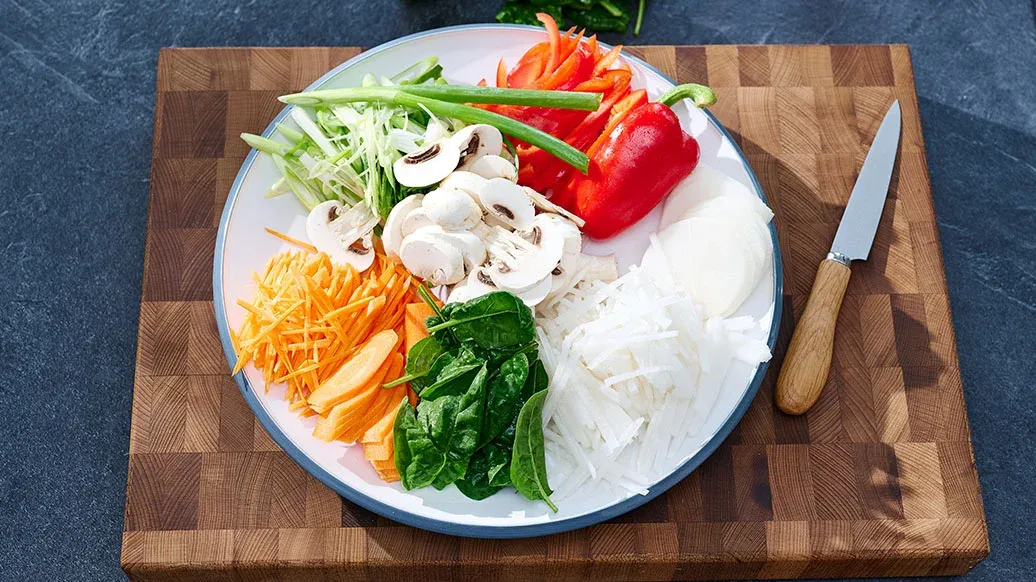 Leikkaa retikka ja porkkana ohuiksi 6 cm pitkiksi tikuiksi. Paloittele kevätsipulit, pinaatti ja paprika 6 cm pitkiksi paloiksi. Leikkaa sienet 5 mm paksuisiksi siivuiksi.