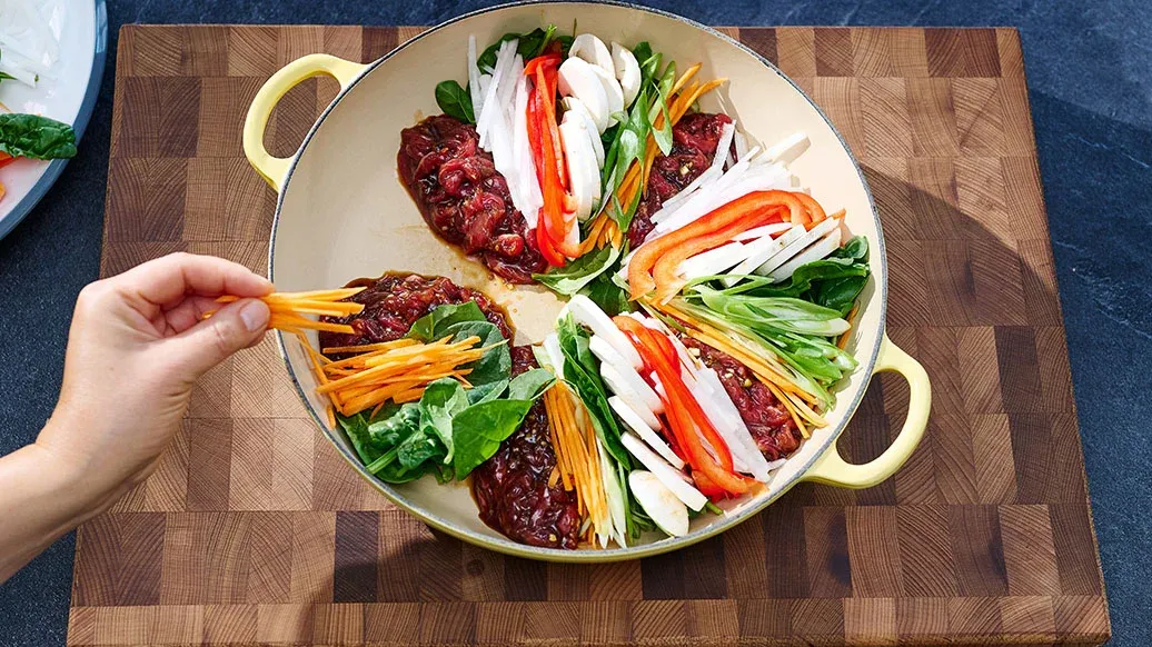 Laita Kikkoman seesamiöljy kattilaan. Jaa vaiheessa 1 marinoitu liha viiteen osaan ja asettele ne ympyrään jättäen osien väliin tilaa. Asettele vaiheen 2 kasvikset lihan väliin ympyrän muotoon.