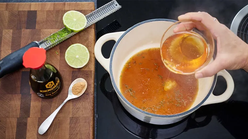 Raasta hieman limetin kuorta, halkaise se sitten ja purista mehu. Laita kuoriraaste ja mehu pieneen kattilaan ja lisää hunaja, Kikkoman soijakastike, kaneli sekä n. 75 ml vettä. Anna kiehua hiljaa 3–5 minuuttia ja lisää sitten halutessasi ruusuvesi.