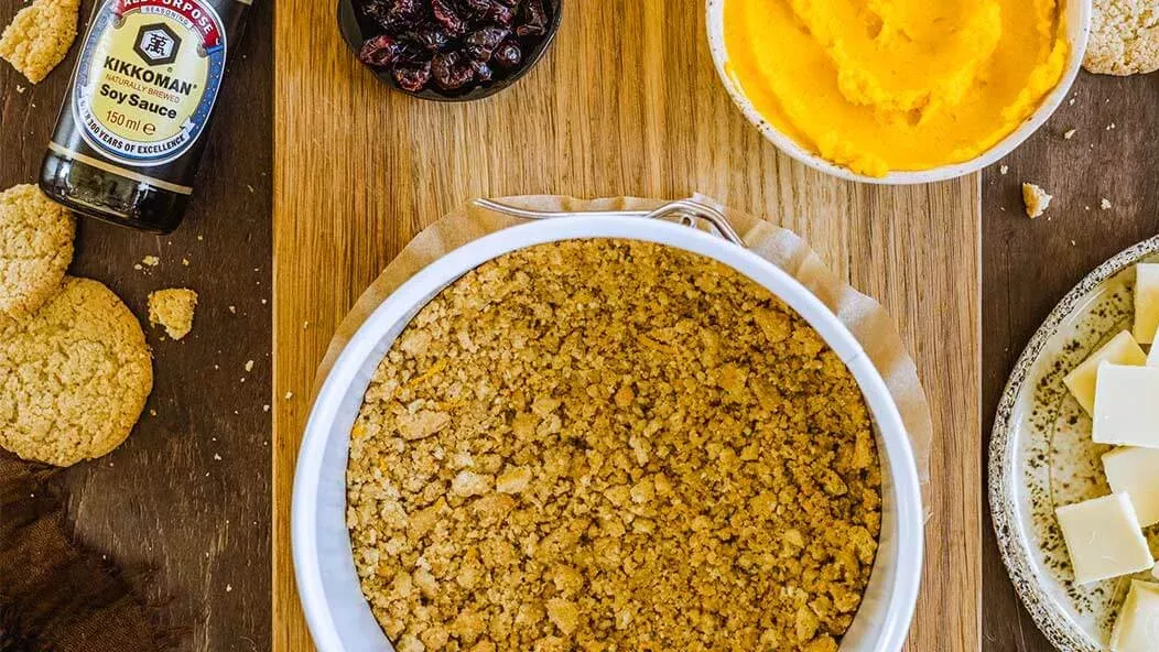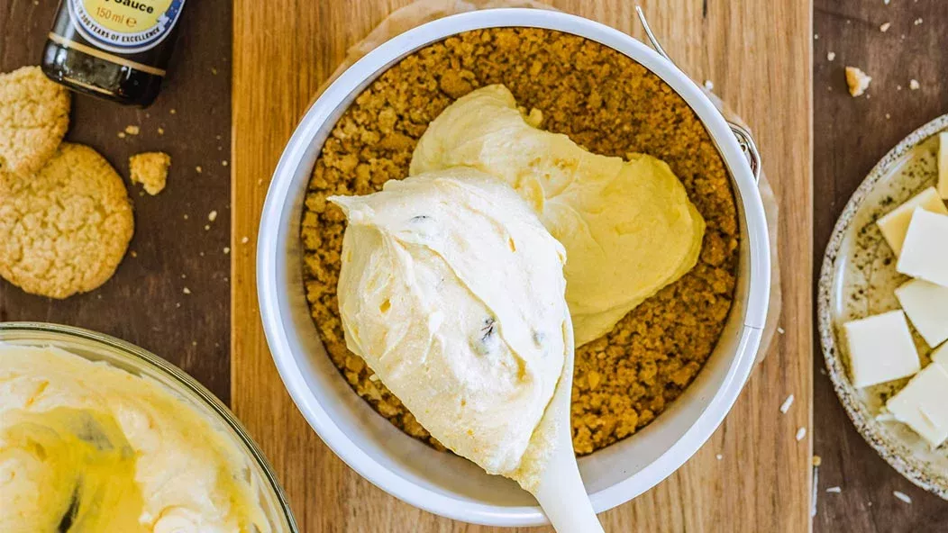 Lämmitä uuni 180 asteeseen. Sekoita murskatut keksit, sulatettu voi ja raastettu appelsiinin kuori. Painele seos leivinpaperilla vuorattuun kakkuvuokaan. Paista 10 minuuttia ja anna jäähtyä.