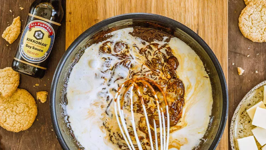 100 g sokeria – 1 rkl voita – 200 g kuohukermaa – 1 rkl Kikkoman luonnollisesti valmistettu soijakastike