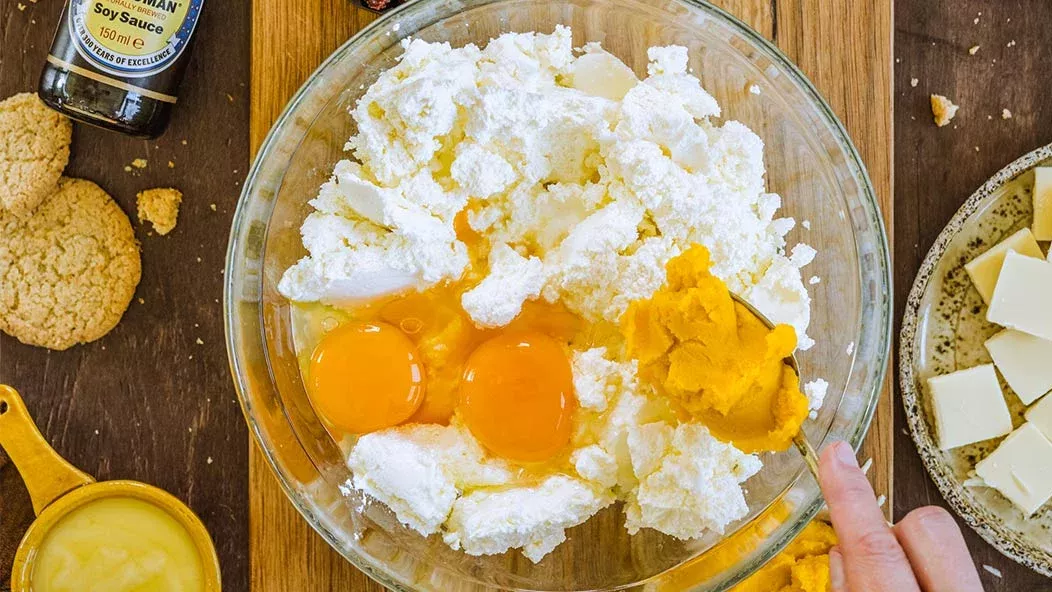 Sulata valkosuklaa ja voi vesihauteessa. Anna jäähtyä. Sekoita raejuuston sekaan kananmunat ja kurpitsasose.
