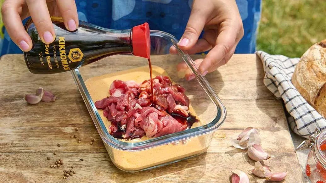 200 g lampaanlapaa ohuina siivuina – 2 valkosipulinkynttä silputtuna – 2 rkl maustamatonta jogurttia – 1 rkl sitruunamehua – 1 rkl oliiviöljyä – 1 tl jauhettua kuminaa – 1 tl paprikajauhetta – ½ tl auhettua korianteria – ½ tl jauhettua kanelia – 4 rkl Kikkoman luonnollisesti valmistettu soijakastike