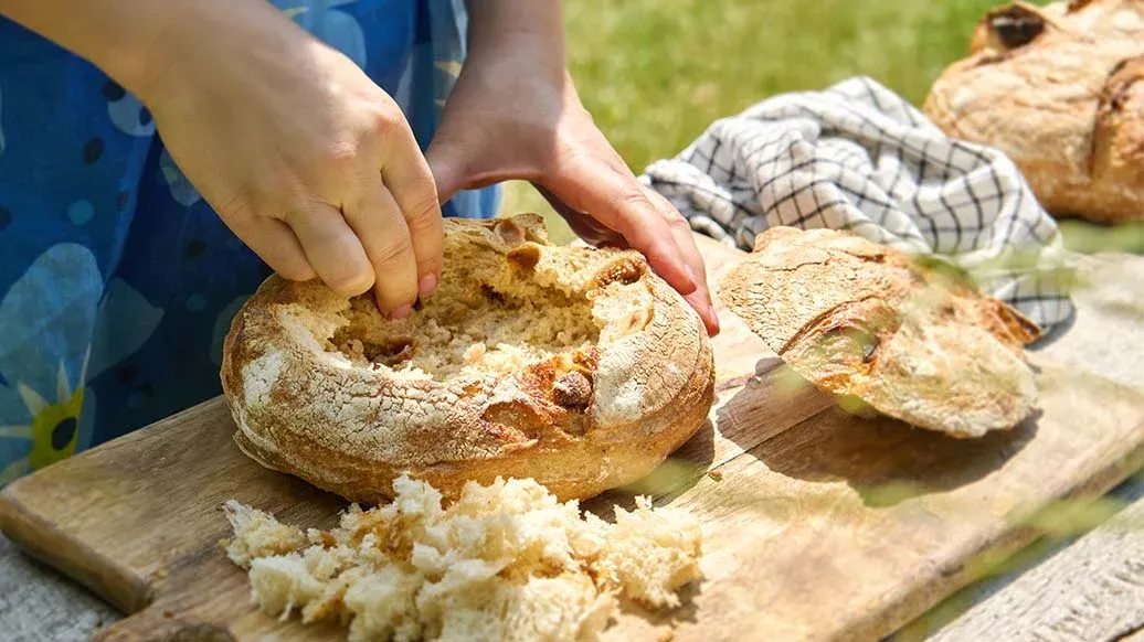 Kokonainen täytetty leipä on helppo napata mukaan vaikkapa piknikille. Tässä versiossa leipä täytetään meheväksi marinoidulla lampaanlihalla sekä pinaatilla, pähkinöillä ja valkosipulikastikkeella.