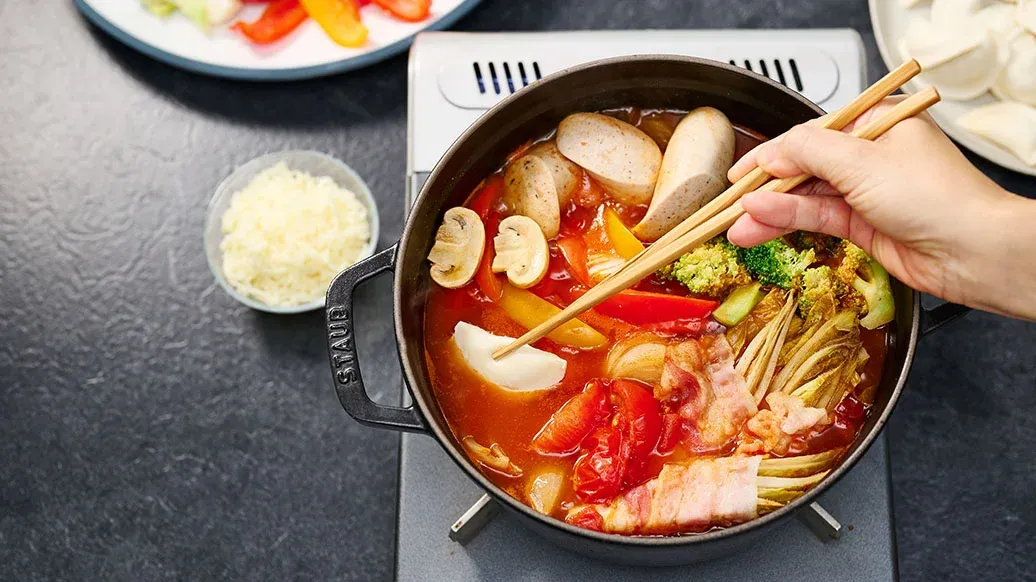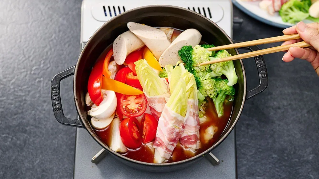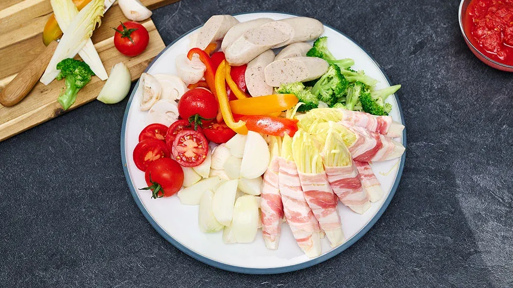 Helppotekoinen hot pot saa hapokkuutta tomaateista ja tulisuutta Kikkoman kimchi-chilikastikkeesta. Pekoni, makkarat sekä juusto tuovat siihen täyteläistä umamin makua. Hot pot valmistuu nopeasti pöydässä ja on kiva jakaa seurueen kesken.