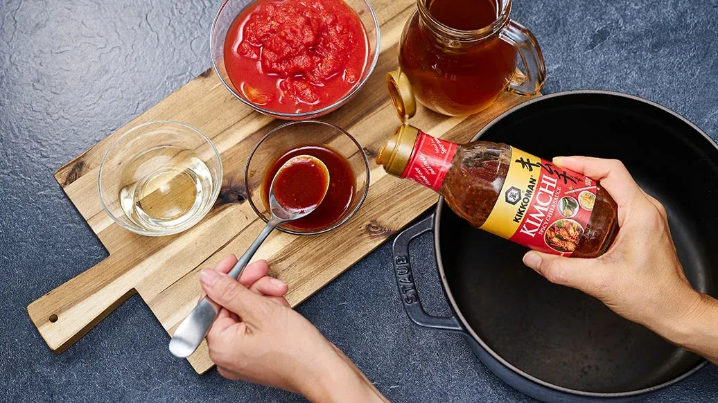 500 ml kanalientä – 400 g tomaattimurskaa – 50 ml valkoviiniä – 4 rkl Kikkoman Mausteinen Chilikastike Kimchille