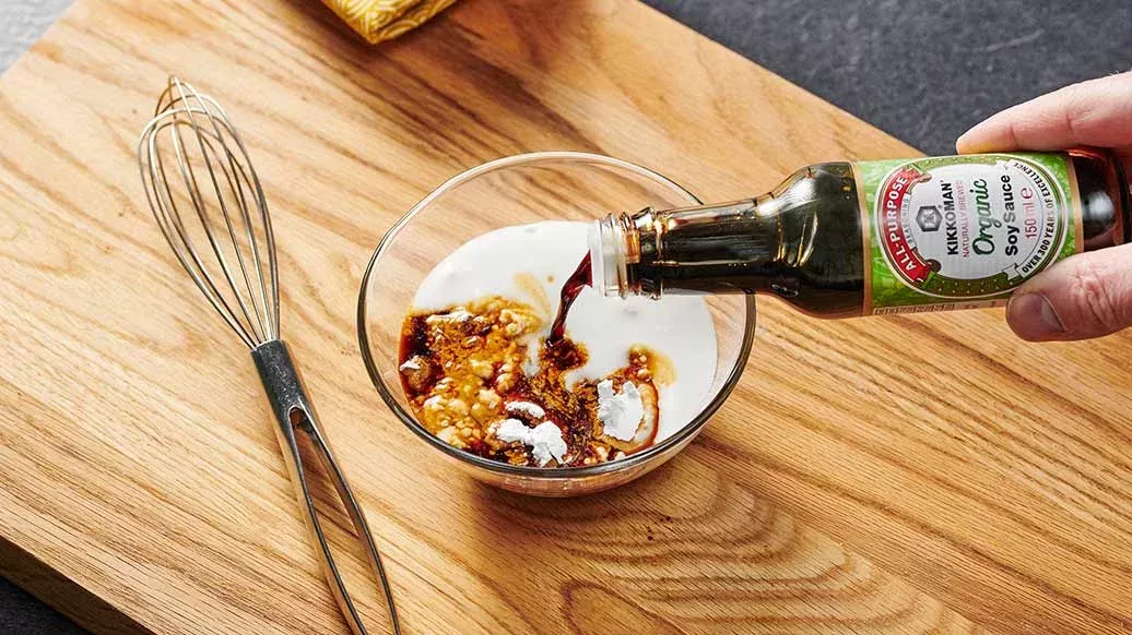 Sekoita Kikkomanin luonnollisesti valmistettu luomusoijakastike, kookosmaito, maissitärkkelys ja 2,5 dl vettä keskenään.