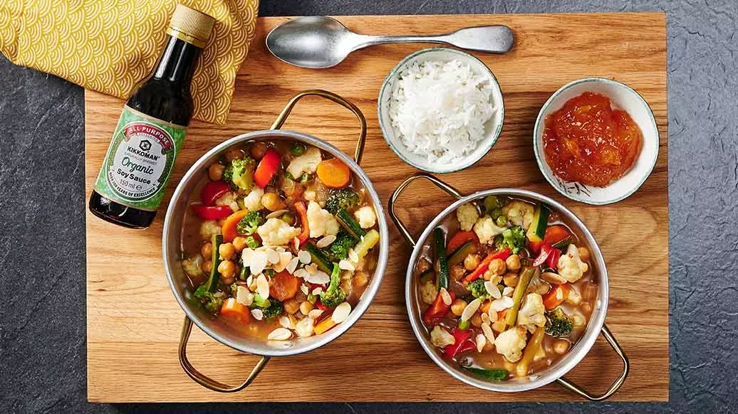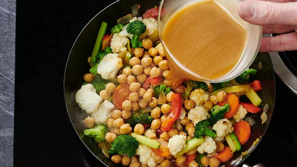 Kuumenna öljy wokkipannussa tai syvässä paistinpannussa keskilämmöllä. Kaada sipulit, inkivääri ja valkosipuli pannulle, lisää joukkoon ripaus curryjauhetta ja anna hautua minuutin ajan jatkuvasti sekoittaen. Lisää joukkoon kasvikset ja paista jatkuvasti sekoittaen 4 minuuttia tai niin kauan, kunnes kasvikset ovat riittävän kypsiä. Lisää joukkoon kikherneet sekä soijakastike-kookosmaitoseos ja kiehauta. Anna kiehua jatkuvasti sekoittaen noin minuutin ajan, kunnes kikherneet ovat kuumenneet.