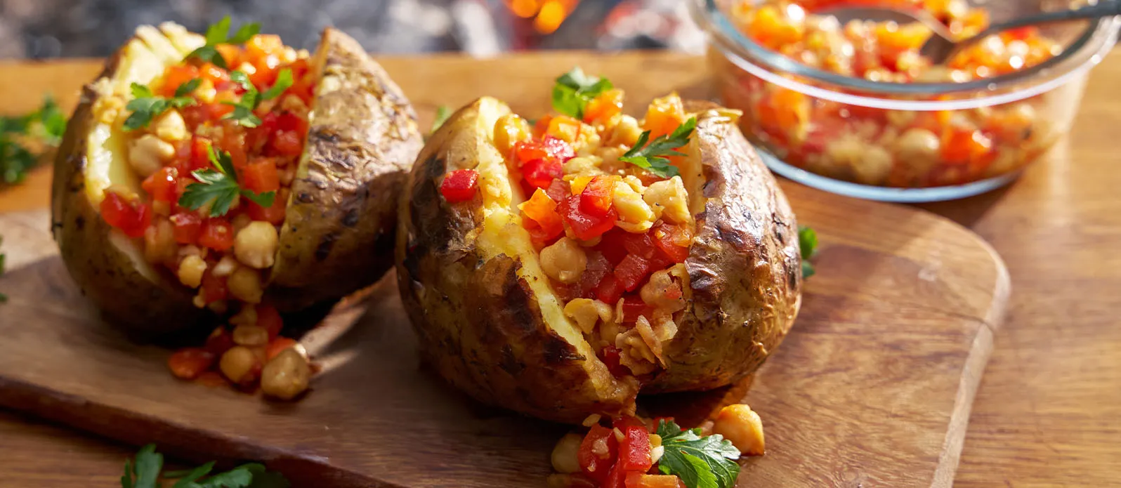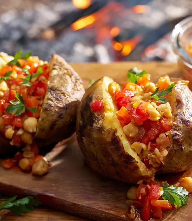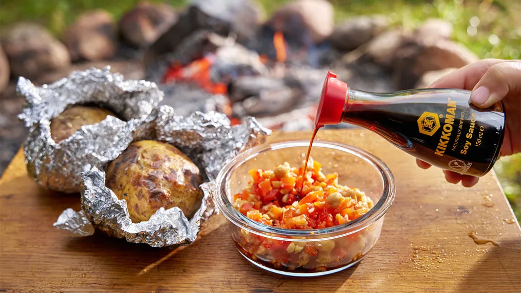 Hiilloksessa kypsennetyissä perunoissa on hennon savuinen aromi ja täytteenä salsa, jossa on paahdettua paprikaa, valkosipulia ja kikherneitä. Kikkoman soijakastike pyöristää salsan maut.