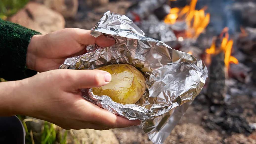 Valuta perunoille rypsiöljyä, kääri folioon ja työnnä hiillokseen. Anna kypsyä n. 40 minuuttia.