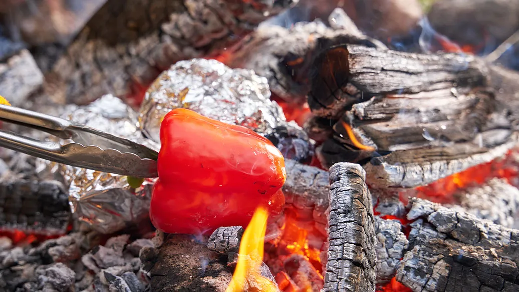 Paahda paprikoita nuotiolla. Laita ne sitten kulhoon, peitä tiiviisti ja anna tekeytyä 10 minuuttia. Irrota paprikoista kuoret.