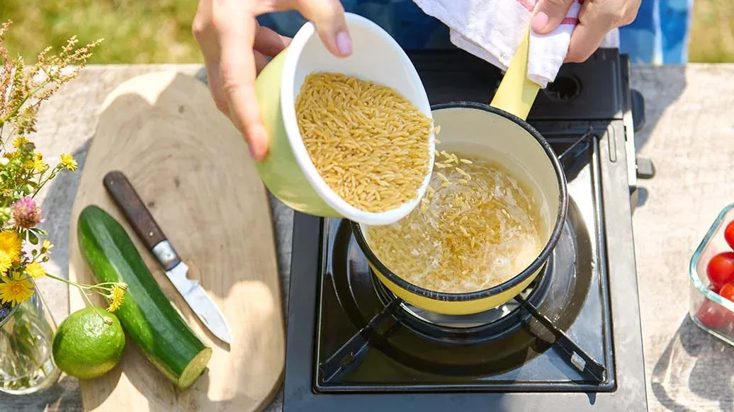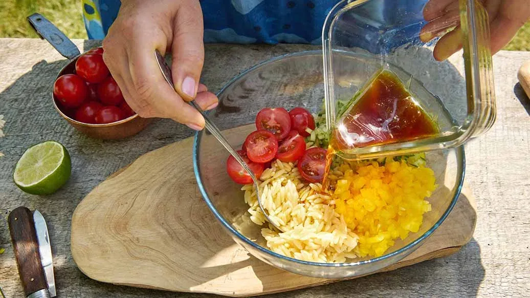 Sekoita jäähtynyt orzo-pasta kasvisten kanssa isossa kulhossa. Kaada limettikastike salaatin päälle ja sekoita varovasti. Koristele tuoreilla yrteillä, pecorinojuustolla ja Kikkomanin poke-kastikkeella.