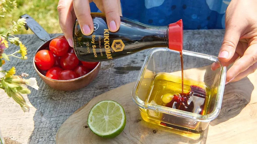 2 rkl tuoretta limettimehua – 2 rkl oliiviöljyä – 2 rkl Kikkoman luonnollisesti valmistettu soijakastike – 1 rkl hunajaa