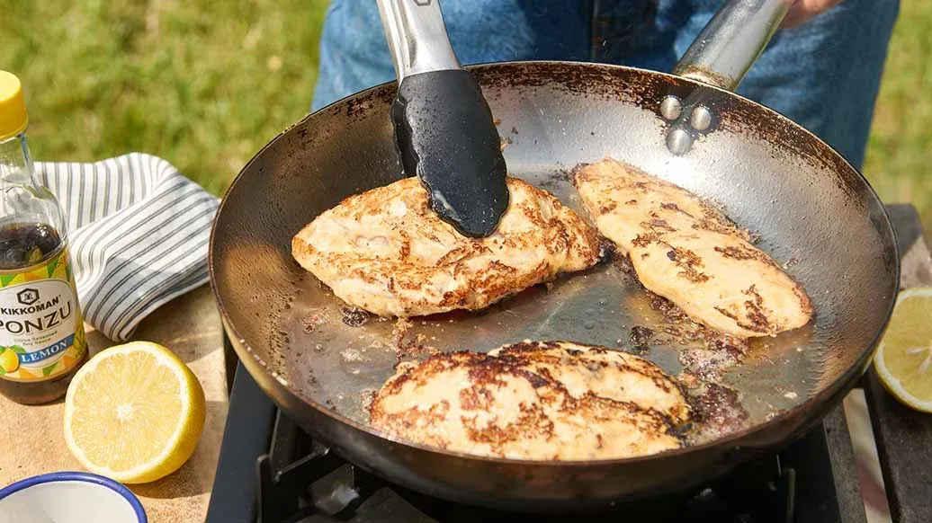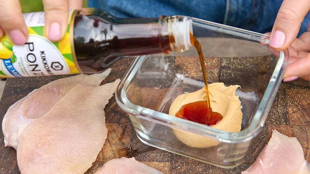 Leikkaa kana siivuiksi (paksuus n. 1,5 cm) ja mausta pippurilla. Sekoita maapähkinävoi ja Kikkoman ponzu-sitrussoijakastike marinadiksi, kierittele kanapalat marinadissa ja jätä marinoitumaan.
