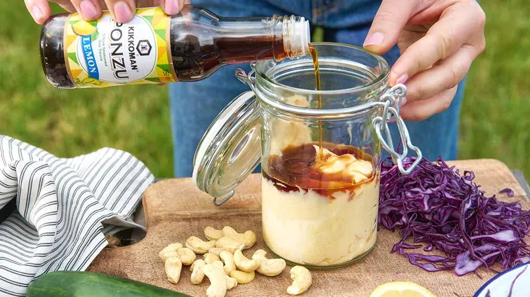 3 rkl majoneesia – 2 rkl maapähkinävoita – 4 rkl Kikkoman Ponzu - Sekoitus Soijakastiketta, etikkaa ja sitruunaa – 1 rkl raastettua sitruunan kuorta