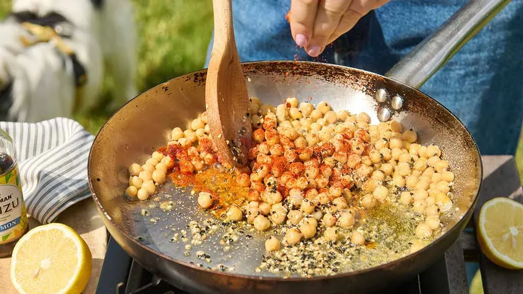 Valuta ja kuivaa kikherneet. Sekoita niihin oliiviöljy ja sitten mausteet ja seesaminsiemenet. Mausta suolalla ja pippurilla. Paahda 200-asteisessa uunissa 20 minuuttia tai paista pannulla.