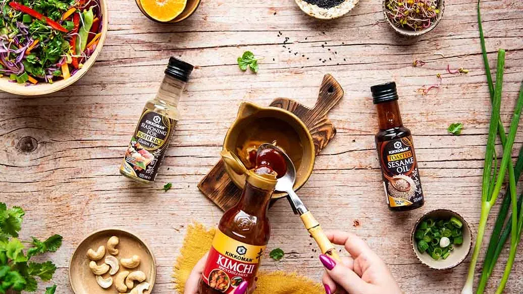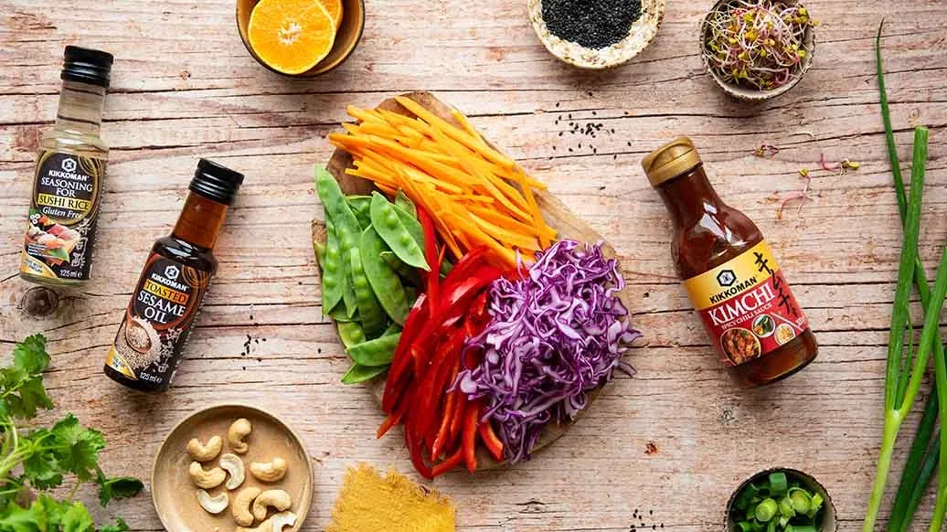 Nyt on salaatissa väriä ja makua! Runsaasti kasviksia sisältävä salaatti koristellaan cashewpähkinöillä, seesaminsiemenillä sekä tuoreella korianterilla. Herkullisessa kastikkeessa on Kikkoman chilikastiketta kimchille sekä seesamiöljyä.