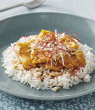 Jaa riisi lautasille, nosta päälle broileripaloja ja kastiketta ja ripottele päälle purjoa ja ruohosipulia. Ripottele annosten päälle vielä paprikajauhetta ja chilirouhetta ja tarjoa.