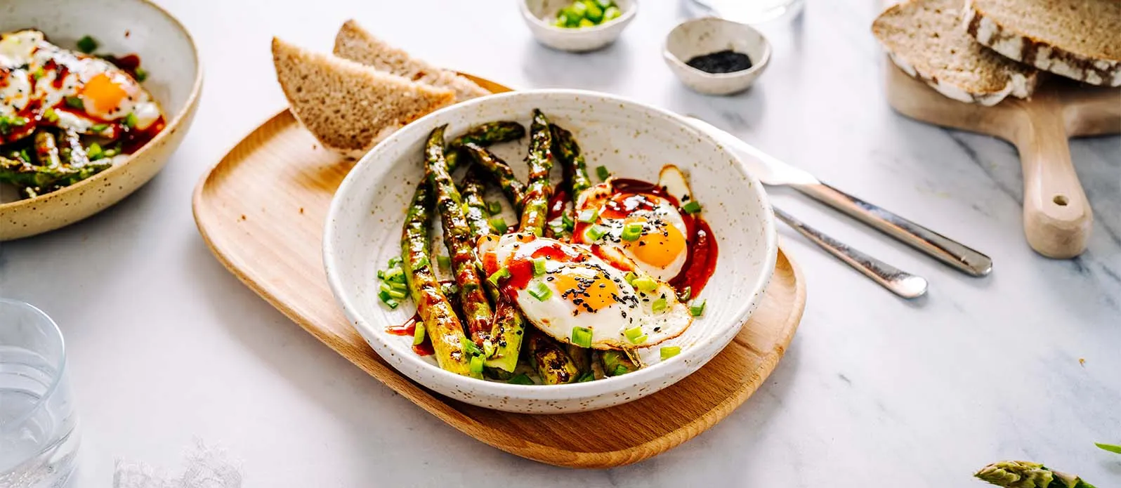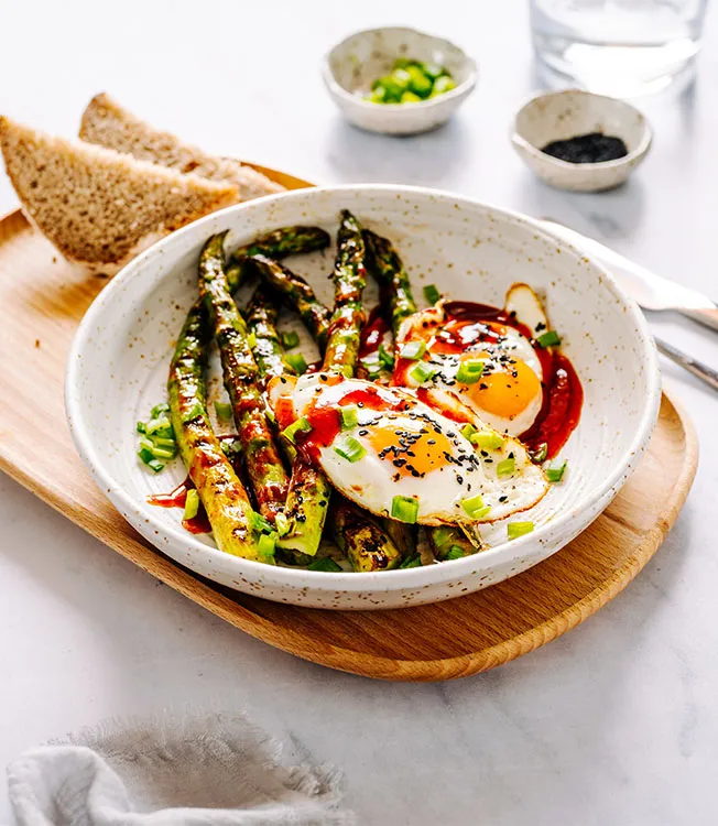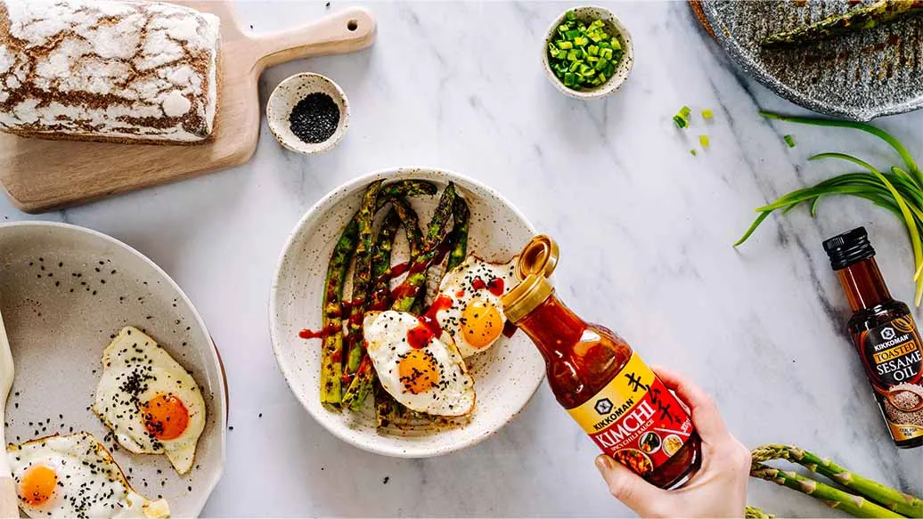 Asettele kananmunat grillattujen parsojen päälle. Kaada päälle Kikkoman chilikastiketta, koristele ruohosipulilla ja tarjoile hapanjuurileivän kera.