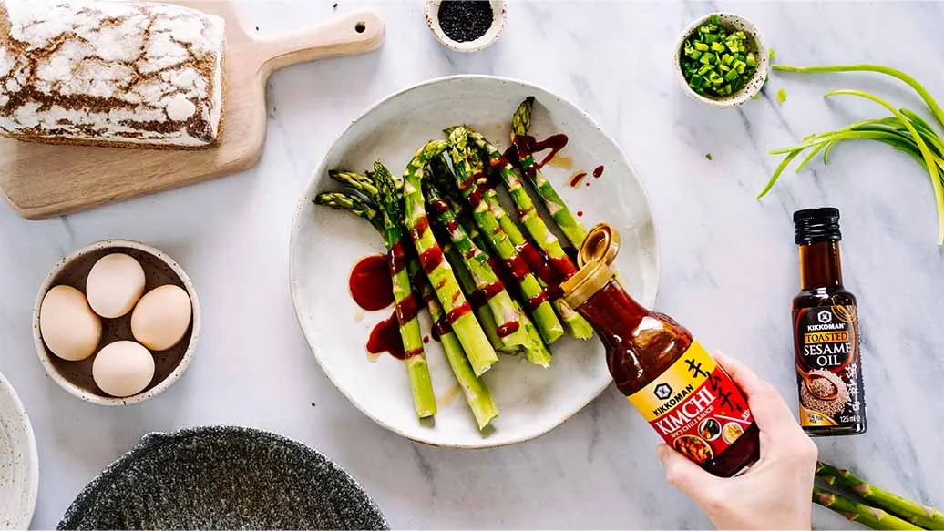 1 nippu vihreää parsaa – 1 rkl Kikkoman paahdettu seesamiöljy – 2 rkl Kikkoman Mausteinen Chilikastike Kimchille