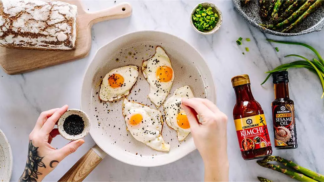 Paistettuja kananmunia, rapeita seesaminsiemeniä ja Kikkoman chilikastikkeella maustettua grillattua parsaa. Selkeät maut ja lempeä chilin polte tuovat mukavasti potkua päivään.