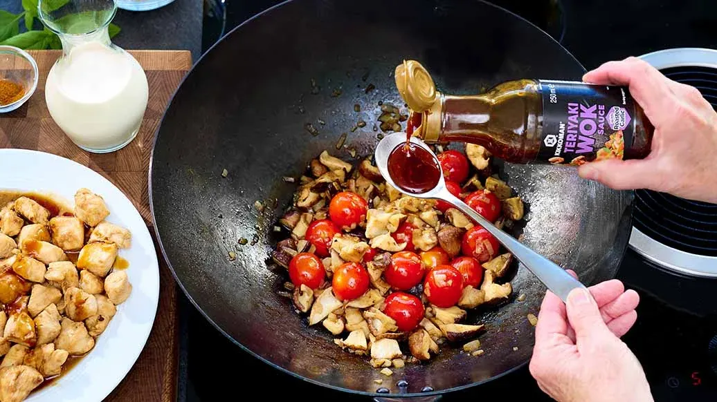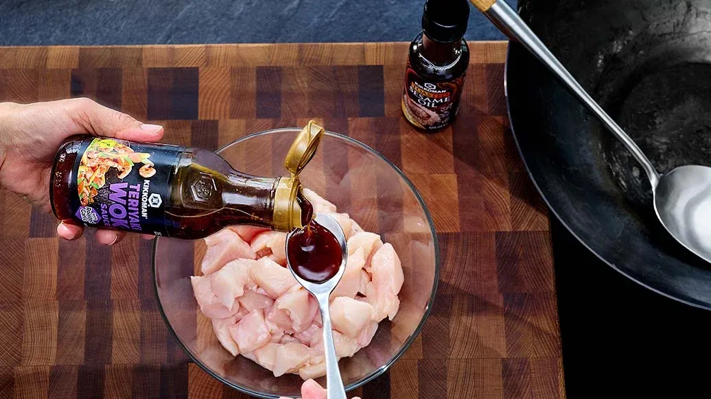 Leikkaa kanan rintafileet kuutioiksi tai suikaleiksi ja marinoi niitä Kikkoman teriyaki wokkikastikkeessa n. 5 minuuttia. Kuumenna Kikkoman seesamiöljy wokkipannulla ja paista kanaa n. 8 minuuttia. Poista pannulta ja jätä odottamaan.