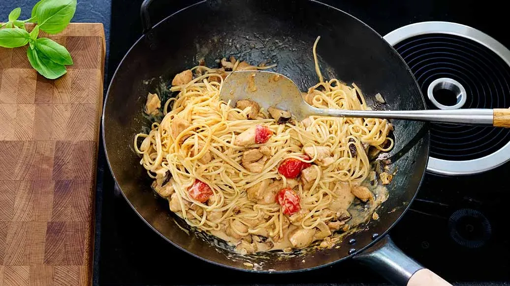 Kun teriyaki kohtaa Pasta Alfredon on luvassa ylivertainen fuusioelämys! Ihanan kermaisessa pastassa yhdistyvät täyteläinen Alfredo-kastike sekä makeansuolainen Kikkoman paahdetulla valkosipulilla maustettu teriyaki wokkikastike.