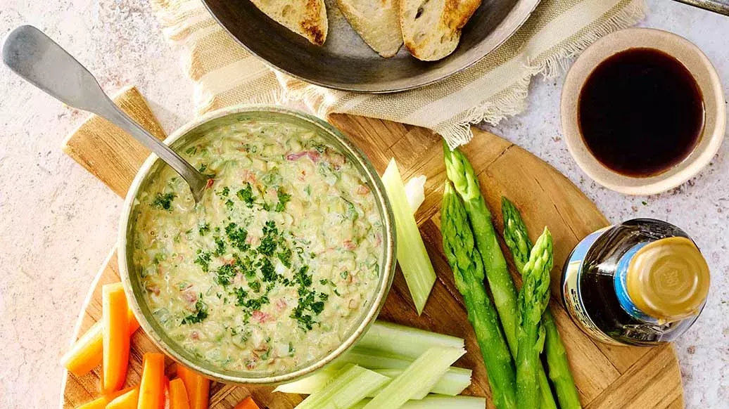 Viipaloi patonki ja paahda viipaleet pannulla. Ryöppää parsaa kiehuvassa, suolatussa vedessä n. 3 minuuttia. Leikkaa porkkana, kurkku, selleri ja parsa tikuiksi. Tarjoile patonkiviipaleet ja vihannekset dipin kera.