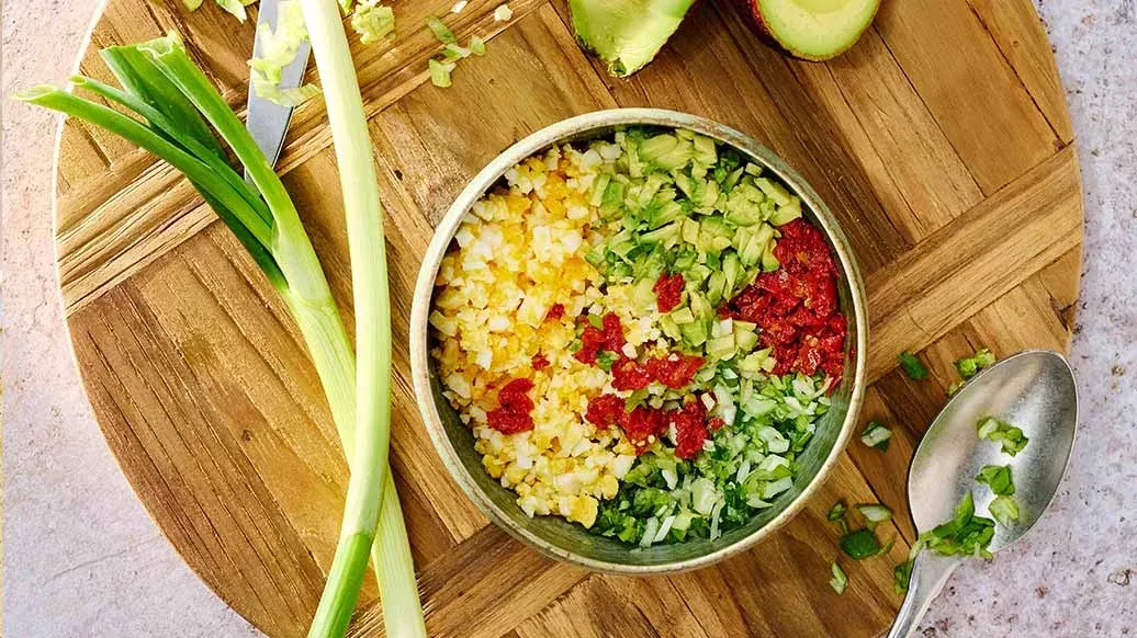 Kuori kananmunat. Pilko munat, avokado, kevätsipuli ja tomaatit ja sekoita ne keskenään.