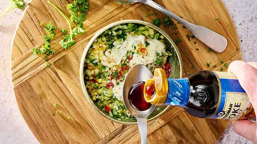 Sekoita pilkottuihin aineksiin Kikkomanin poke-kastike, majoneesi, balsamietikka, persilja, chilijauhe ja pippuri.