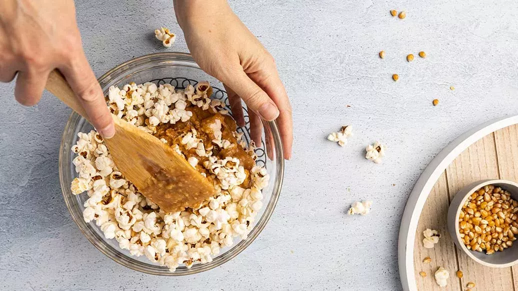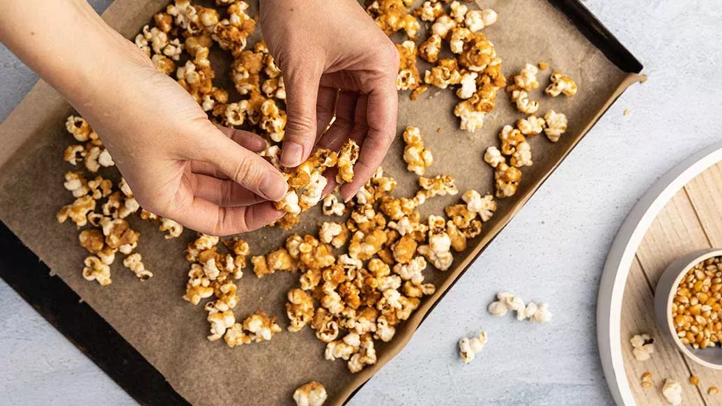 Levitä kinuski-popcorn leivinpaperilla vuoratulle uunipellille. Anna sen kovettua ja murenna se sitten paloiksi kulhoon.