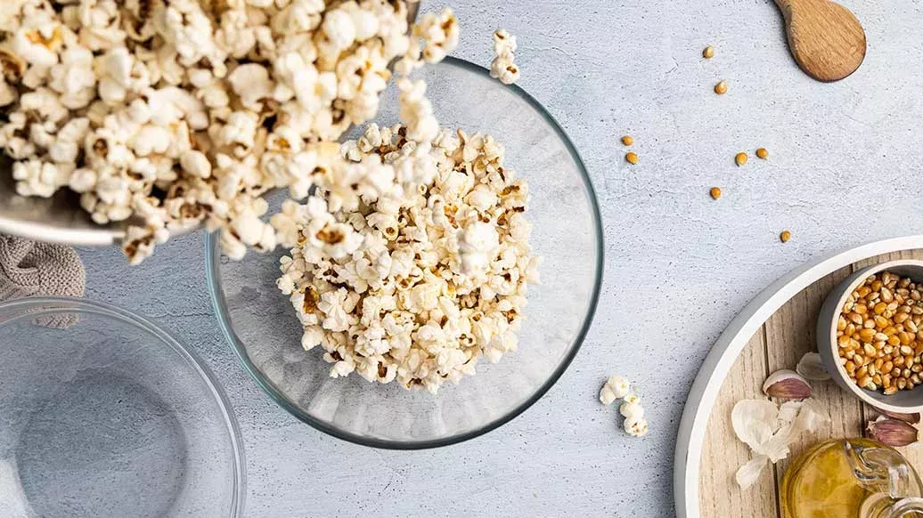 Kuumenna rypsiöljy paksupohjaisessa kattilassa. Lisää popcornin jyvät ja peitä kannella. Kun kaikki jyvät ovat poksahtaneet, jaa ne kahteen kulhoon.