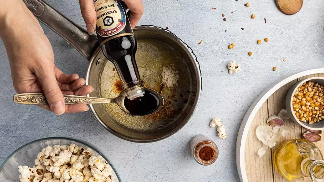 Kaada sokeri ja vesi pannulle kinuskin valmistusta varten. Lämmitä, kunnes sokeri on liuennut ilman sekoittamista. Heiluttele pannua varovasti, jotta sokeri jakaantuu pannulle tasaisesti. Kun seos muuttuu kullanruskeaksi, lisää voi ja Kikkomanin soijakastike. Sekoita ja kaada toiseen popcorn-kulhoon.