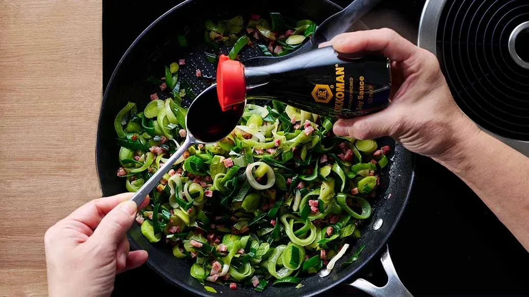 2 ohutta purjoa – 125 g kuutioitua pekonia – 2 rkl Kikkoman luonnollisesti valmistettu soijakastike
