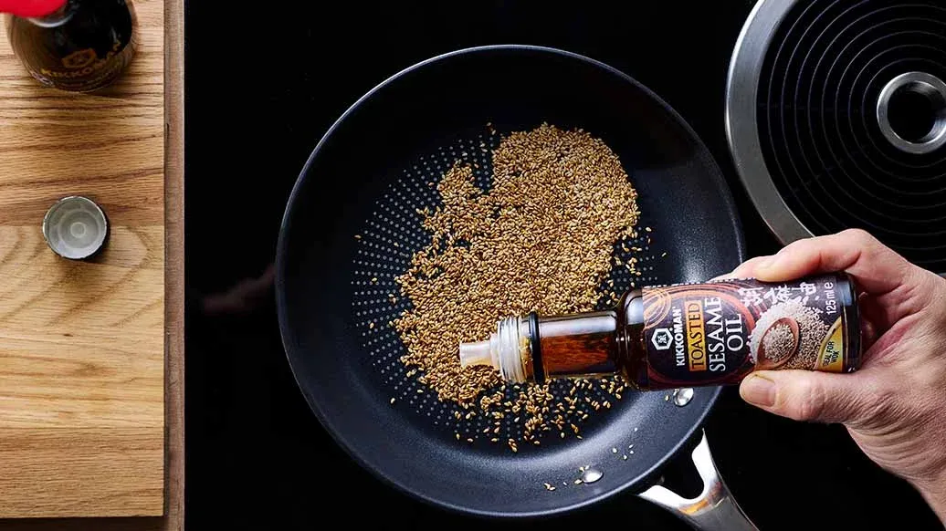 2 rkl seesaminsiemeniä – 2 rkl Kikkoman paahdettu seesamiöljy – 2 rkl Kikkoman luonnollisesti valmistettu soijakastike
