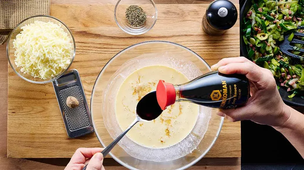 Sekoita täytettä varten kananmunat, kerma ja Kikkoman soijakastike. Lisää juustoraaste sekä timjami ja mausta pippurilla sekä muskottipähkinällä. Levitä purjo-pekoniseos vuokaan ja kaada päälle munaseos. Paista 180-asteisessa uunissa 25–35 minuuttia, kunnes quiche on kullanruskea.