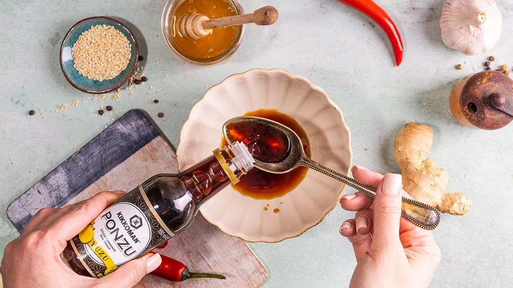 Sekoita kulhossa Kikkoman yuzu ponzu -kastike (tai Kikkoman ponzu-sitrussoijakastike) sekä hunaja, silputtu chili ja inkivääri.