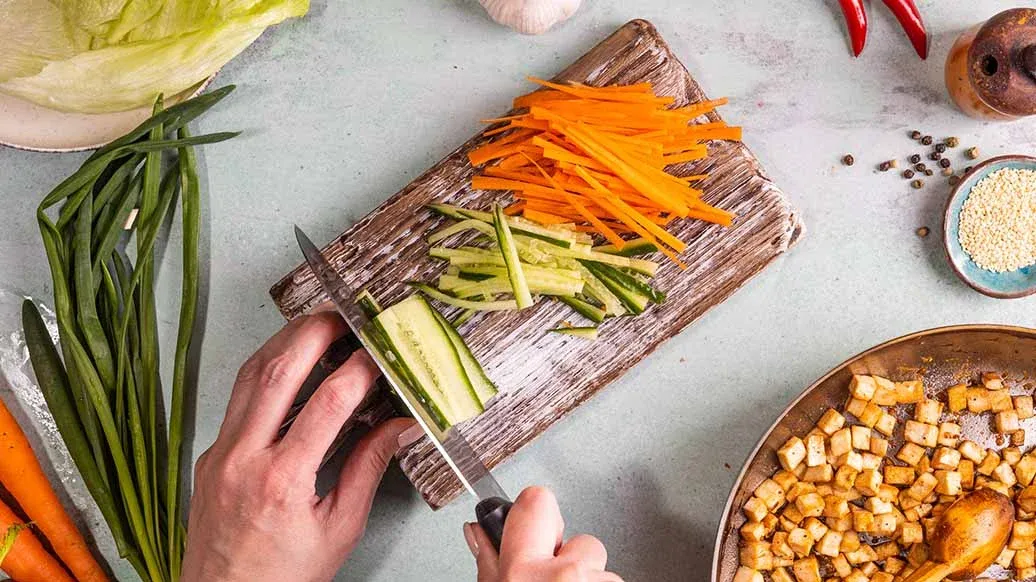Kuumenna öljy paistinpannulla. Lisää marinoitu tofu ja paista kuutiot kullanruskeiksi kaikilta sivuilta. Leikkaa porkkana ja kurkku ohuiksi suikaleiksi ja salaatti pieniksi paloiksi.