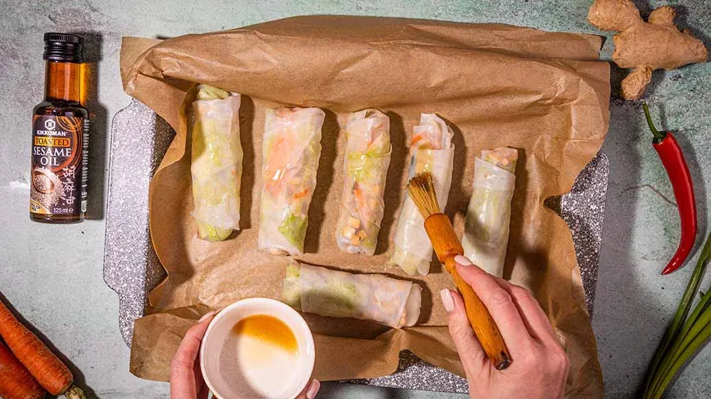 Liota riisipaperiarkkeja lämpimässä vedessä ja taputtele ne varovasti kuivaksi. Asettele kullekin arkille tofua sekä kasviksia ja kääri ne rullaksi. Voitele rullat Kikkoman seesamiöljyllä ja paista 200-asteisessa uunissa tai airfryerissa 15 minuuttia.