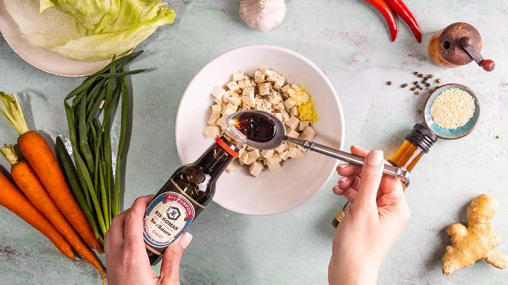 Leikkaa tofu kuutioiksi ja laita ne kulhoon. Lisää joukkoon Kikkoman seesamiöljy, Kikkoman soijakastike, mustapippuri, inkivääri ja valkosipuli. Sekoita hyvin, jotta tofukuutiot ovat kauttaaltaan kastikkeen peitossa.