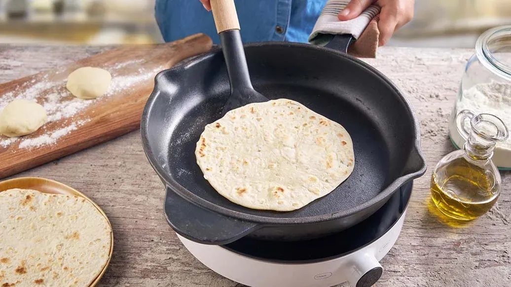 Sekoita valkosipuli ja oliiviöljy. Lisää lämmin vesi vähitellen jauhojen joukkoon samalla sekoittaen. Lisää sitten valkosipuliöljy ja vaivaa taikinaa n. 5 minuuttia, kunnes se on sileää ja kimmoisaa. Peitä kulho kostealla liinalla tai tuorekelmulla ja jätä taikina kohoamaan 20 minuutiksi. Jaa se sitten neljään osaan ja muotoile ne palloiksi. Ripottele niiden päälle loput 20 g jauhoja ja kauli ohuiksi leiviksi. Kuumenna kuiva pannu (keskilämpö/kova lämpö) ja paista kutakin chapati-leipää 20–30 sekuntia per puoli, kunnes niihin alkaa tulla kullanruskeita ja hiiltyneitä kohtia.