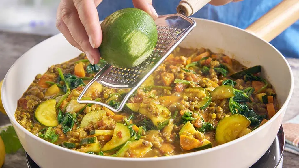 Aromaattisessa dal-muhennoksessa on vihreitä mungpapuja, pinaattia, porkkanoita ja tomaattia. Lisämakua tuovat sitruunamehu, limetin kuori ja Kikkoman vähemmän suolaa sisältävä soijakastike. Annoksen viimeistelee tuore korianteri.
