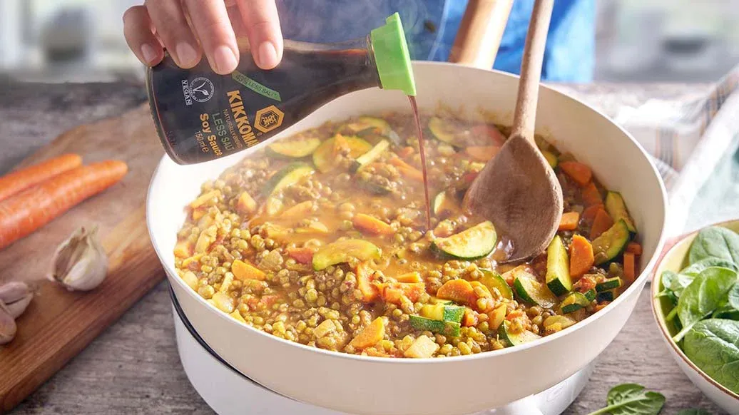Keitä mungpapuja kasvisliemessä 35–40 minuuttia. Viipaloi porkkana ja kesäkurpitsa. Kuullota sipulia, valkosipulia, porkkanaa ja kesäkurpitsaa kirkastetussa voissa 3–4 minuuttia. Lisää kumina, kurkuma, kaneli ja chili ja paista 10–15 sekuntia vapauttaaksesi aromit. Sekoita joukkoon keitetyt mungpavut, tomaattimurska ja Kikkoman vähemmän suolaa sisältävä soijakastike. Anna kiehua hiljaa 5 minuuttia, lisää pinaatti ja keitä vielä 1 minuutti.