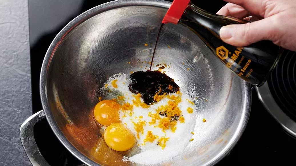 Sekoita keltuaiset, sokeri, vaniljatangon siemenet, appelsiininkuori ja Kikkoman-soijakastike kulhossa vesihauteessa. Anna seoksen saostua hieman.