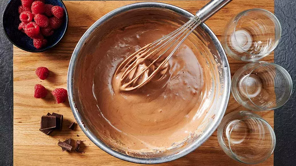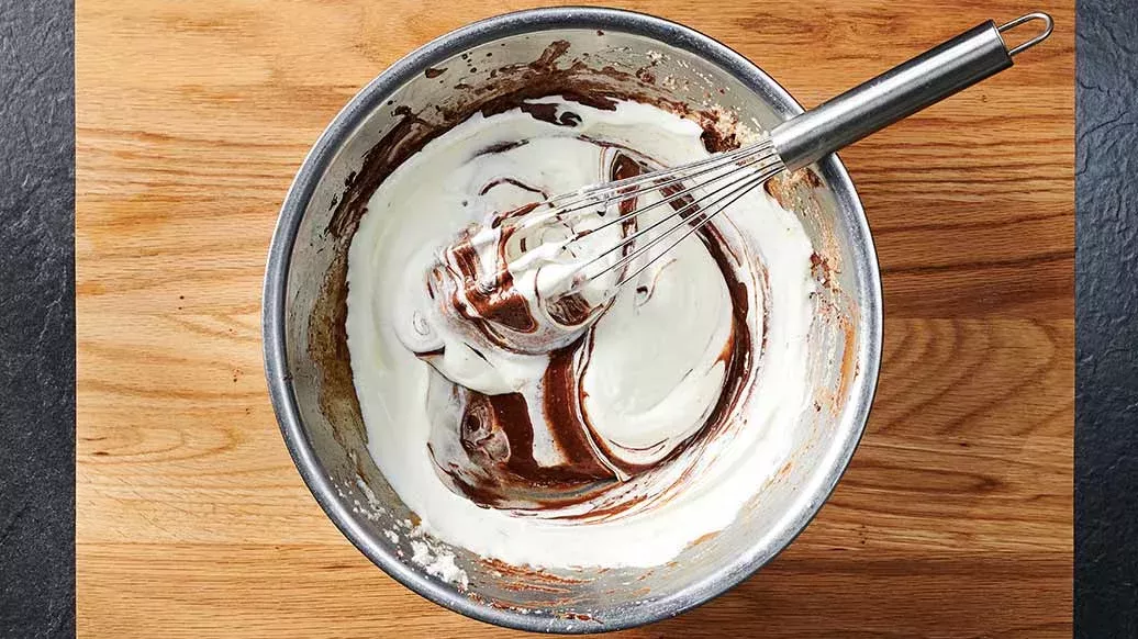 Ota kulho vesihauteesta. Nostele keltuaisseoksen sekaan vuorotellen valkuaisvaahto, suklaa ja kermavaahto.
