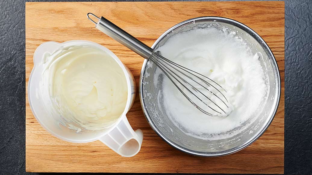 Vatkaa kerma kiinteäksi vaahdoksi omassa kulhossaan. Vatkaa valkuaiset kovaksi vaahdoksi.