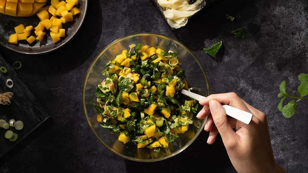 Valmista ensin salsa: leikkaa inkivääri pienemmiksi paloiksi ja sekoita mangon, mintun, kevätsipulin, Kikkoman seesamiöljyn ja Kikkoman teriyakikastikkeen kanssa. Jätä tekeytymään.